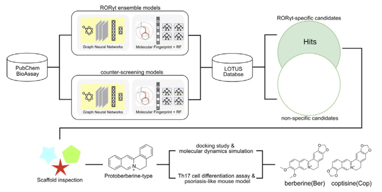 아주대 공동 연구팀은 인공지능(AI) 기반 분자 예측 모델과 가상 스크리닝(virtual screening)을 활용해 약 20만 종의 천연물 라이브러리를 분석했다. 연구팀은 예측된 상위 후보물질 중 화학계통학 분석을 통해 ‘프로토베르베린 알칼로이드(protoberberine alkaloids)’ 계열 화합물을 최종 선정했으며, 코프티신(coptisine)과 베르베린(berberine)이 RORγt에 직접 결합해 Th17 세포의 분화와 염증 유발 기능을 억제한다는 것을 단백질-천연물 결합, 분자 도킹 연구(docking study), 마우스 모델 등을 통해 규명했다.
