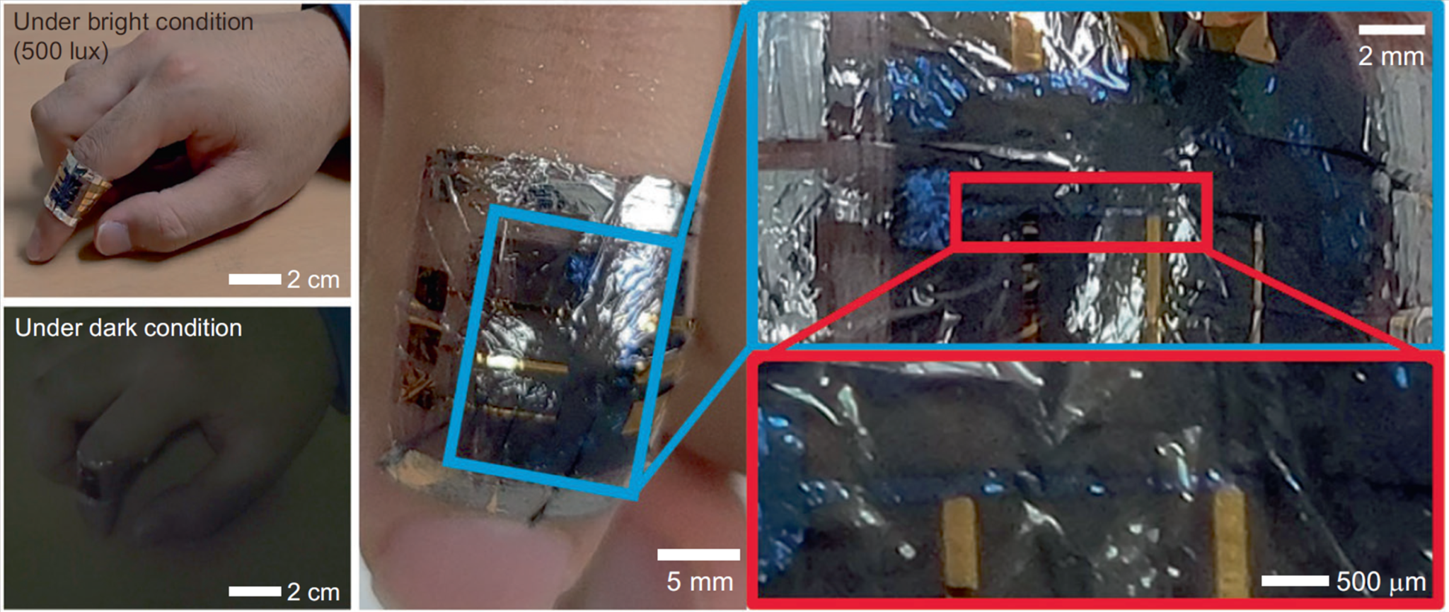 * 위 그림 설명 : 초박막·초유연 근적외선 유기 광검출기(NIR-OPD)의 사람 피부에 대한 실제 적용 모습. 밝은 환경(500 lux)과 어두운 환경 모두에서 피부 굴곡과 움직임에도 안정적으로 밀착·동작함을 확인할 수 있다(왼쪽). 가운데 이미지는 손등 피부 위에 부착된 센서의 전체 모습이며, 오른쪽은 센서 활성 영역과 전극 구조를 단계적으로 확대한 광학 이미지로, 수 μm 두께의 초박막 소자가 미세한 피부 곡면에서도 손상 없이 유지됨을 보여준다.