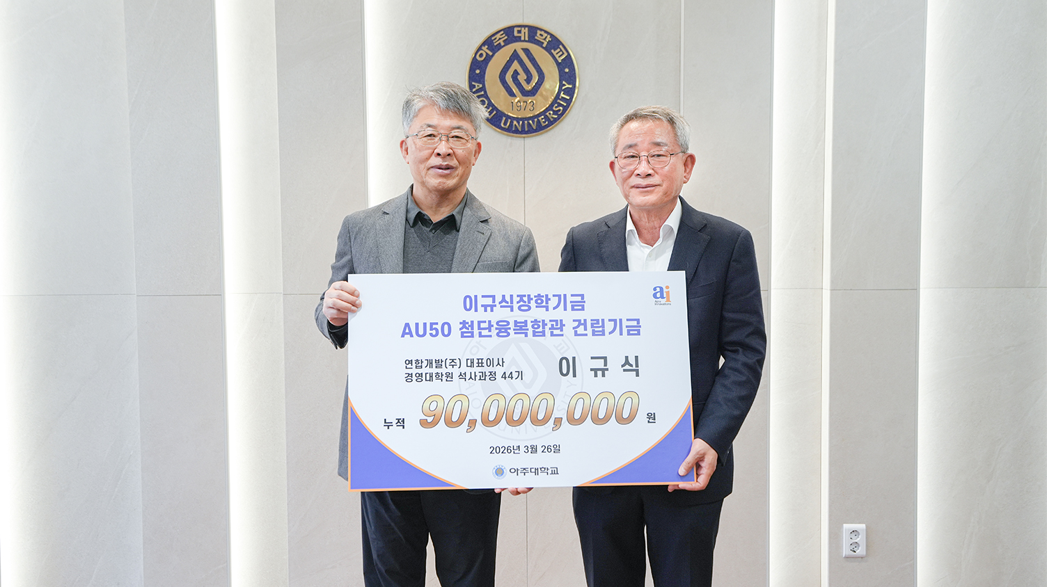 26일 율곡관 총장실에서 열린 기부금 전달식에는 채교석 ㈜두두인터내셔널 대표이사, 이규식 ㈜연합개발 대표이사, 김동율 주식회사 액트(ACTS) 대표이사가 참석했다. 학교에서는 최기주 총장과 조경숙 대학발전본부장, 강민철 경영인텔리전스학과 교수가 자리했다. 최기주 총장이 아주가족을 대표해 감사 인사를 전하고, 감사패와 예우품을 전달했다.
