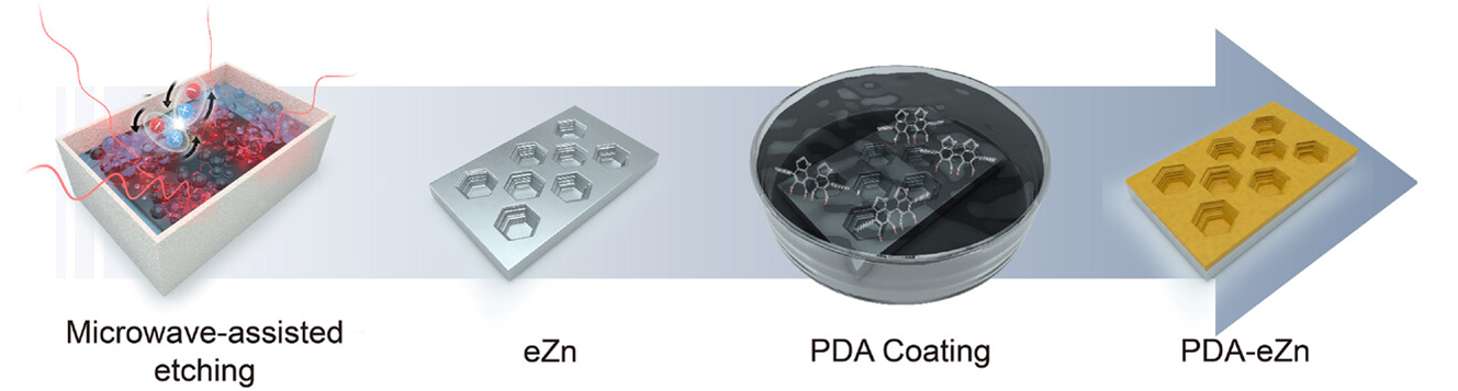 이러한 문제를 해결하기 위해 연구팀은 두 가지 아이디어를 결합했다. 먼저 전자레인지 등의 작동에 활용되는 전자기파(마이크로파)를 이용해 아연 표면을 단 1분 만에 미세한 구멍 구조로 만들었다. 이 구조는 전류가 고르게 흐르도록 도와 금속이 한쪽으로 뾰족하게 자라는 것을 막는다. 여기에 더해, 홍합 접착 성분에서 착안한 ‘폴리도파민(polydopamine, PDA)’이라는 얇은 보호막을 입혀 물과의 불필요한 반응을 줄였다. 즉 ‘구조를 바꾸고 보호막을 씌우는 방식’으로 배터리를 안정화한 것.