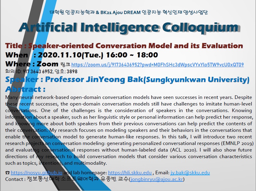 Artificial Intelligence Colloquium [대학원 인공지능학과 콜로퀴엄]개최 안내
