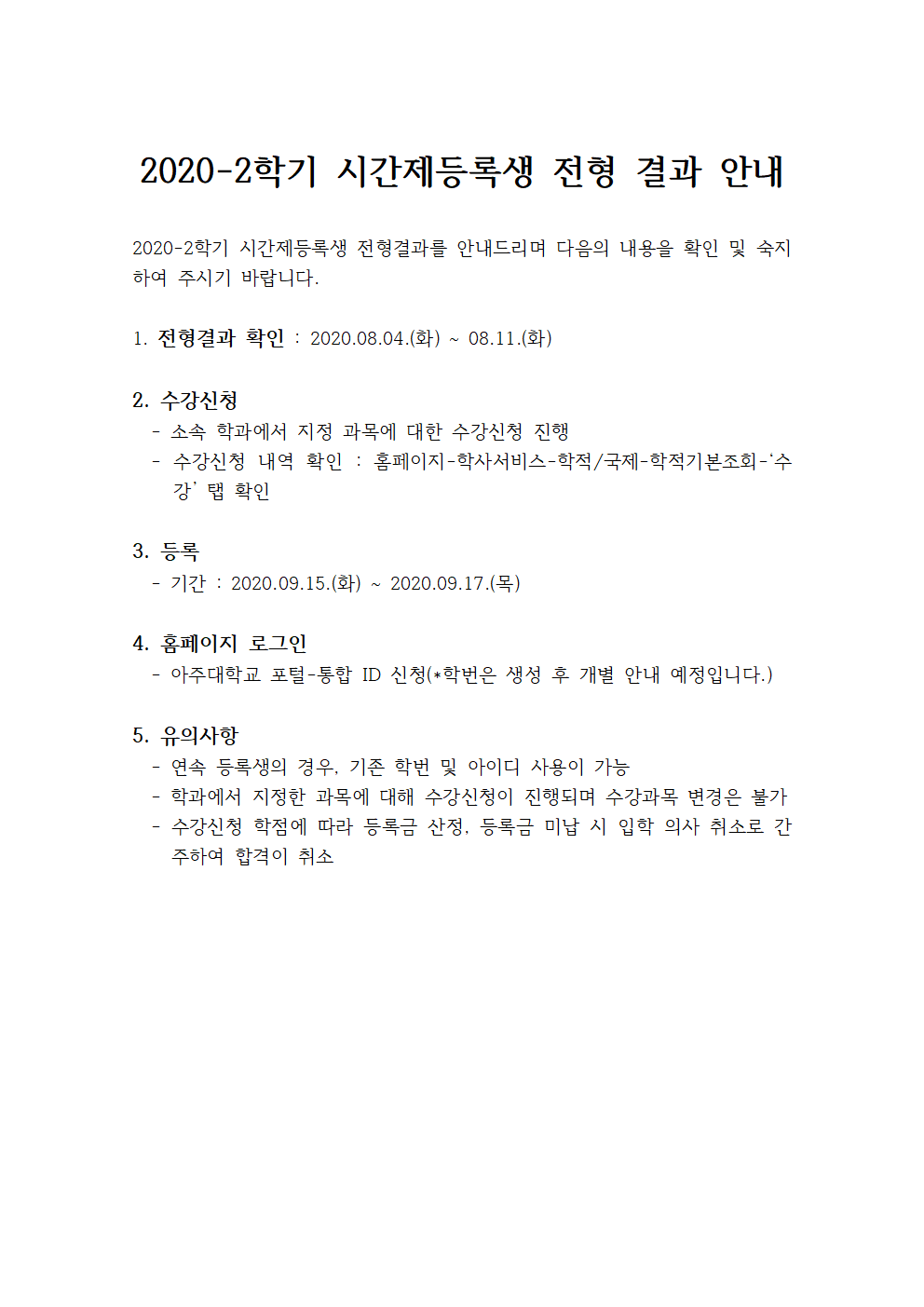 2020-2학기 시간제등록생 전형 결과 안내