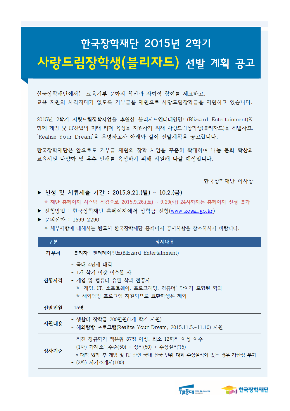 [한국장학재단] 2015년 2학기 사랑드림장학생(블리자드) 신청 안내
