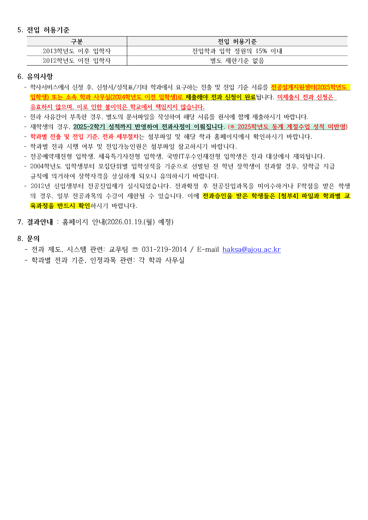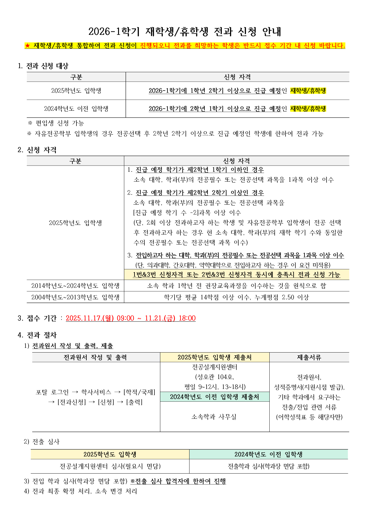 [공지] [학사] 2026-1학기 재학생/휴학생 통합 전과 신청 안내