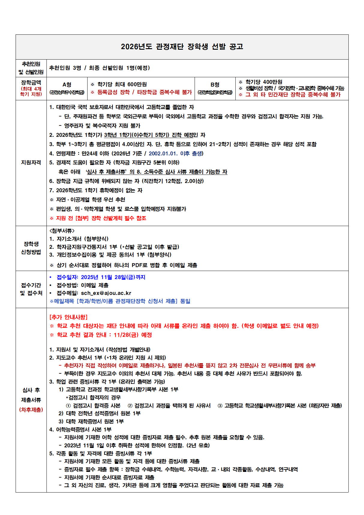 [장학] [교외장학] 2026년도 관정재단 장학생 선발 공고 기간 연장 (~11/28(금)까지)