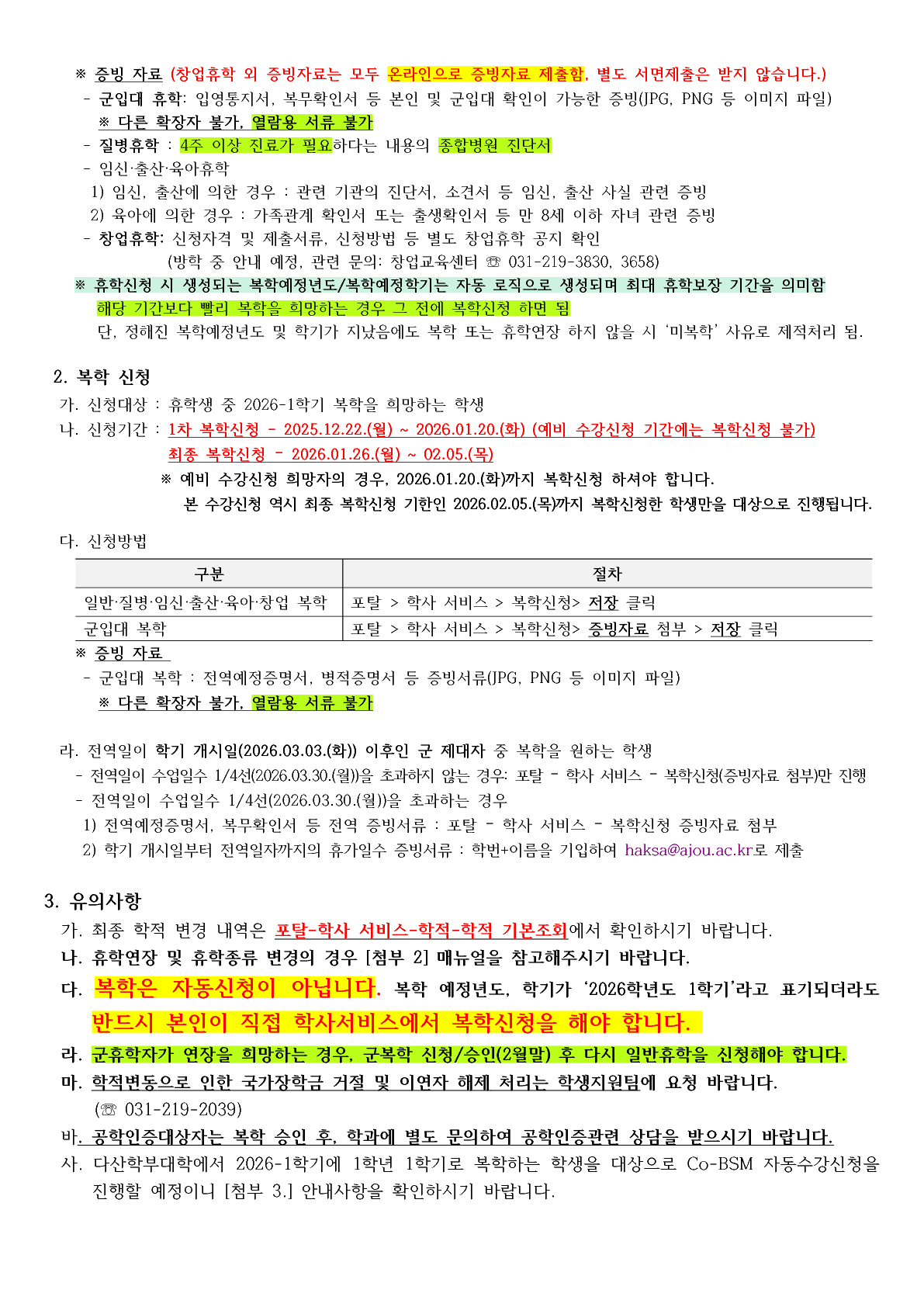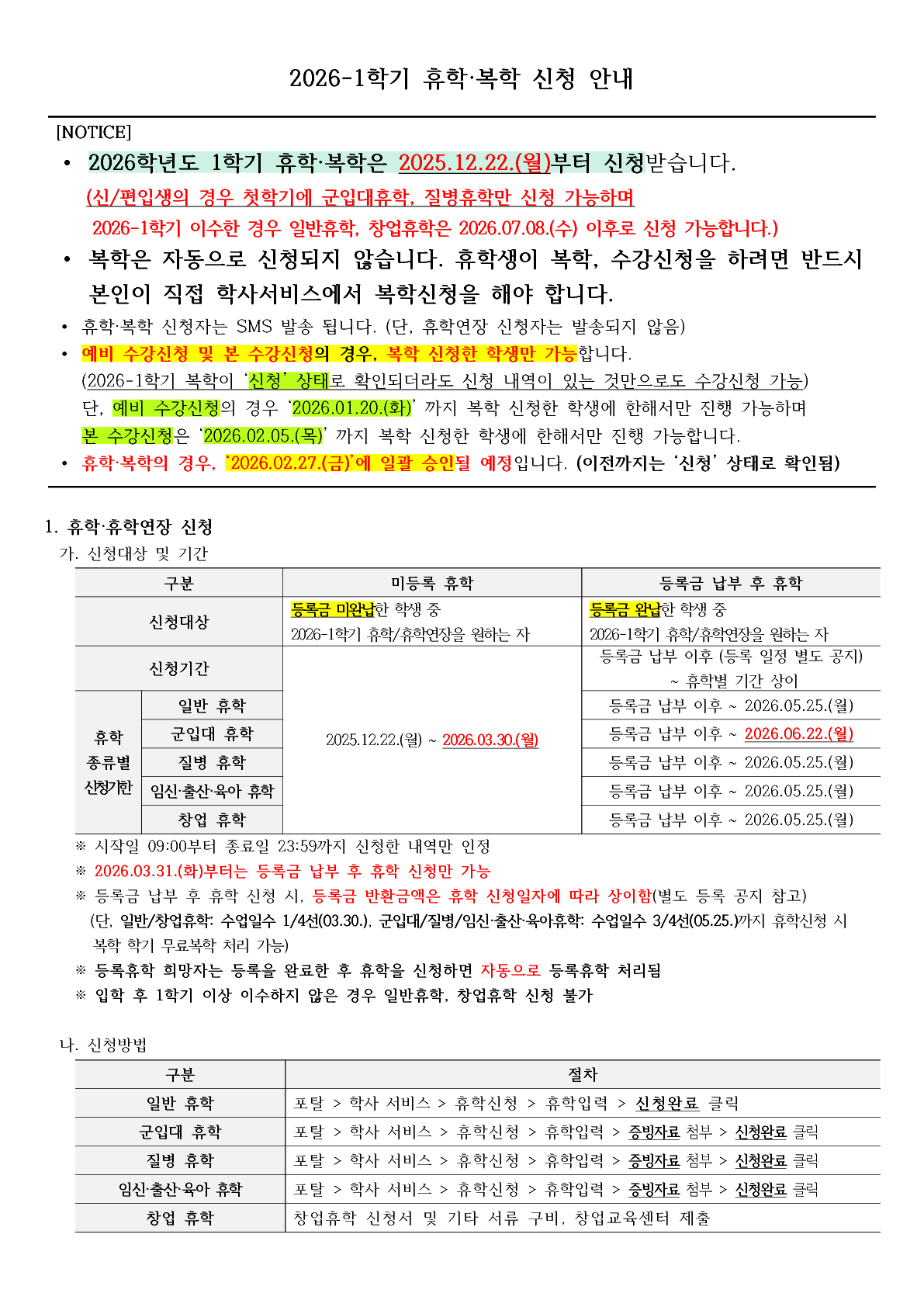 [공지] [학사] 2026-1학기 휴학/복학 신청 안내