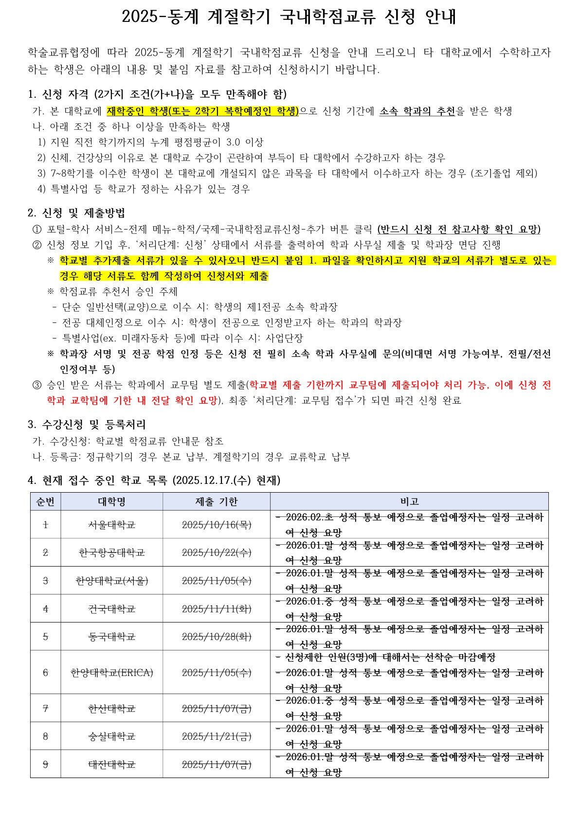 [학사] [학부/학사과정] (25.12.17.) 2025-동계 계절학기 국내대학 학점교류 신청 안내