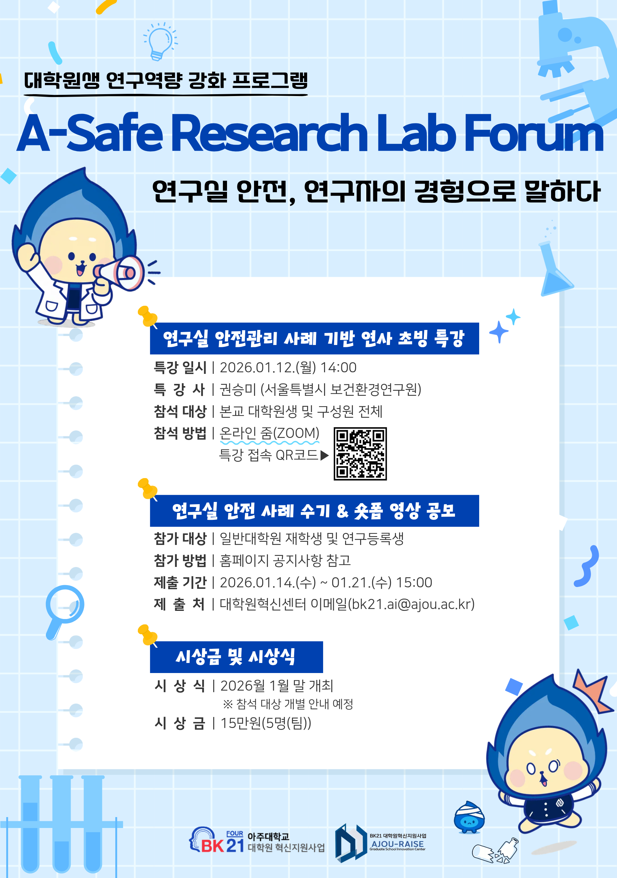 대학원혁신센터에서 대학원생 연구역량 강화를 위해 <A-Safe Research Lab Forum(2025)>을 개최합니다.