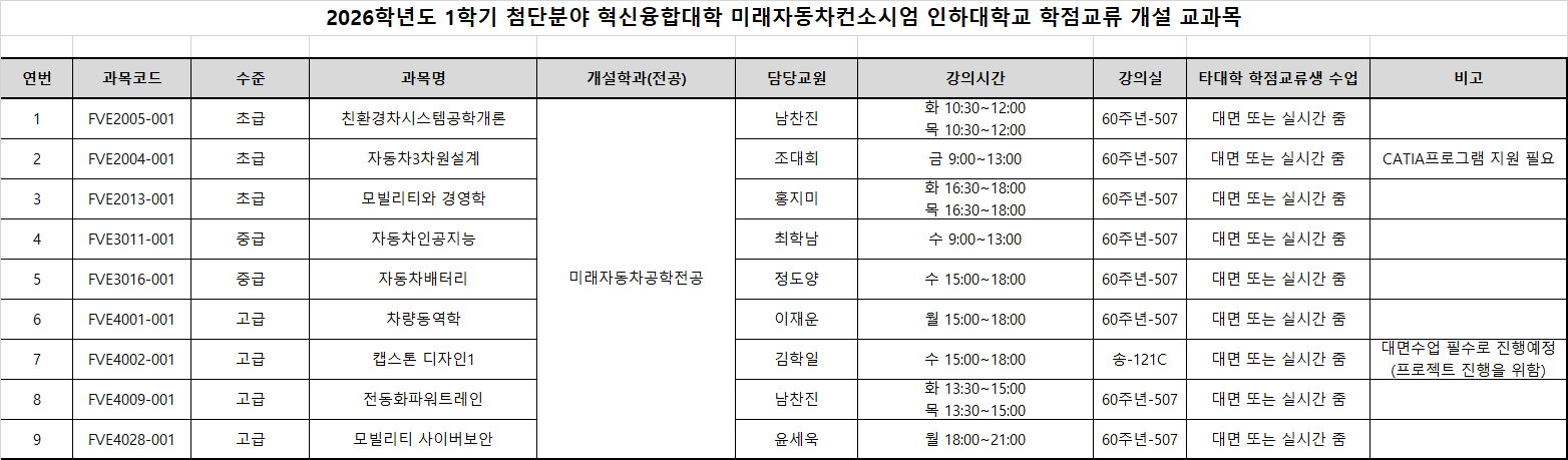 [학사] 2026학년도 1학기 미래자동차 학점교류(인하대학교) 신청 안내( ~ 2/5 목 18:00 까지)