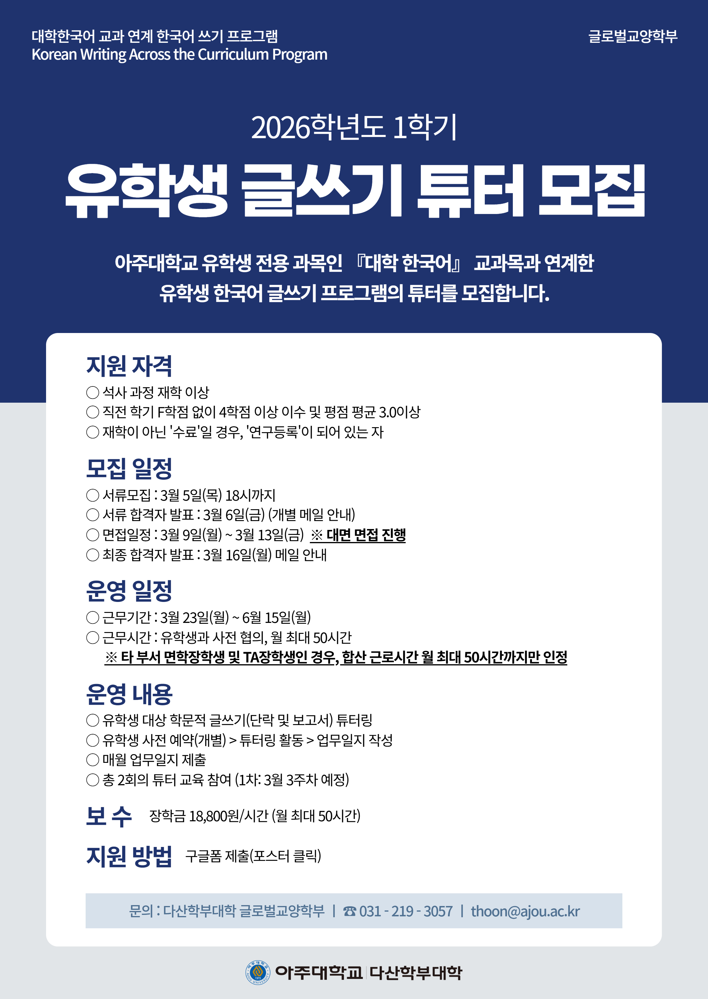 [비교과] [글로벌교양학부](대학원생) 26-1 한국어 글쓰기 클리닉 튜터 모집(~ 3/5(목) 18시까지)