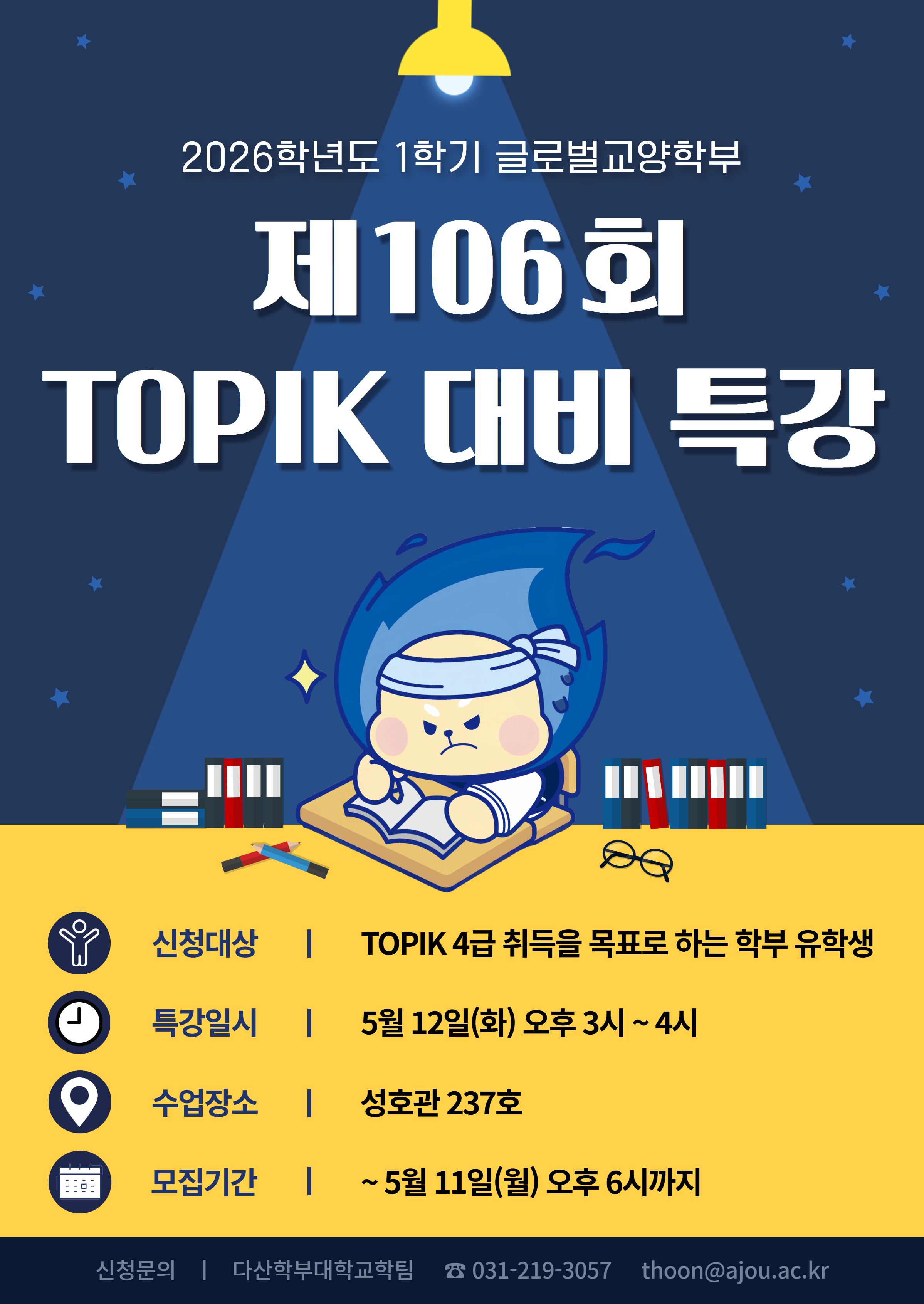 [비교과] [글로벌교양학부] 제106회 TOPIK 대비 특강(~5/11(월) 18시까지)
