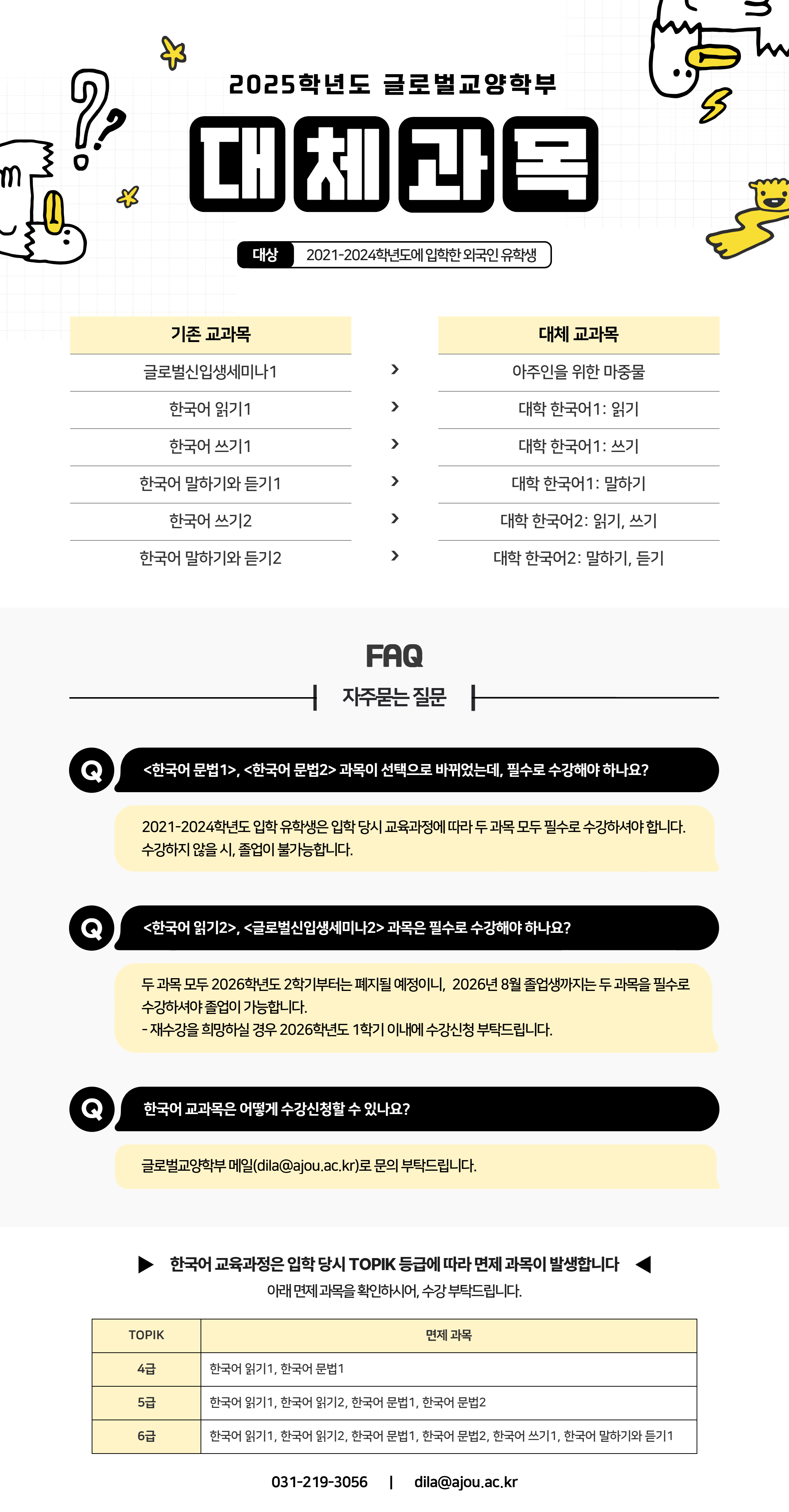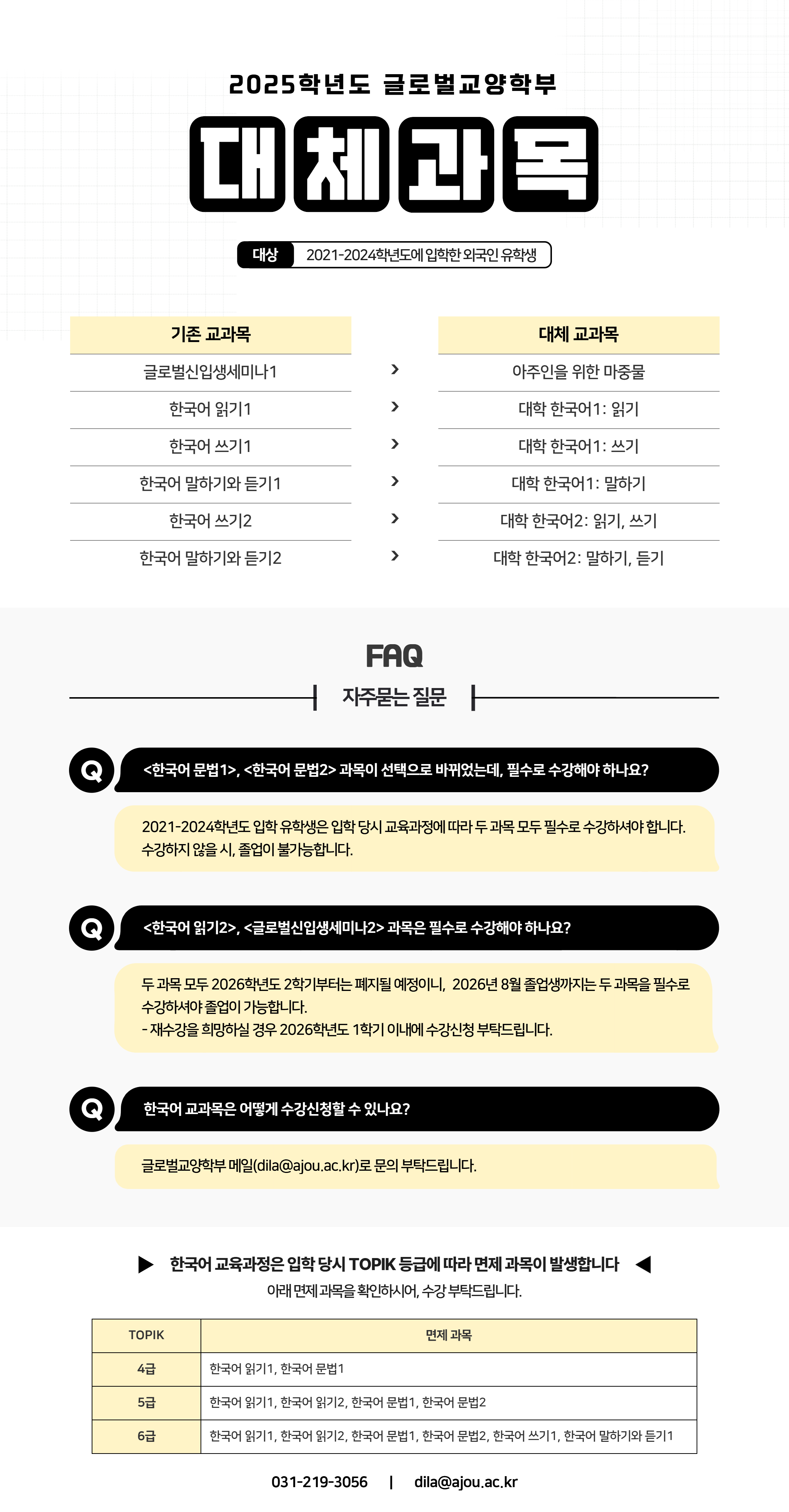 2025학년도 한국어 교육과정(외국인 유학생 대상)이 개편됨에 따라 대체과목 공지드립니다.